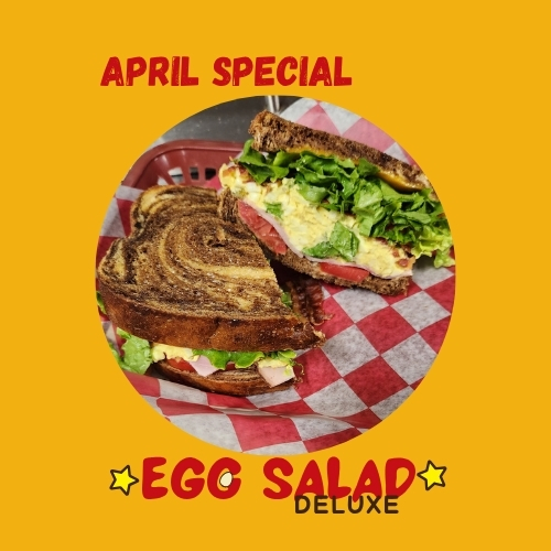 April Special: Egg Salad Deluxe Housemade egg salad piled high on rye with ham, bacon, lettuce, tomato & cheddar. Try it with our World Famous ‘Nanner Puddin’!